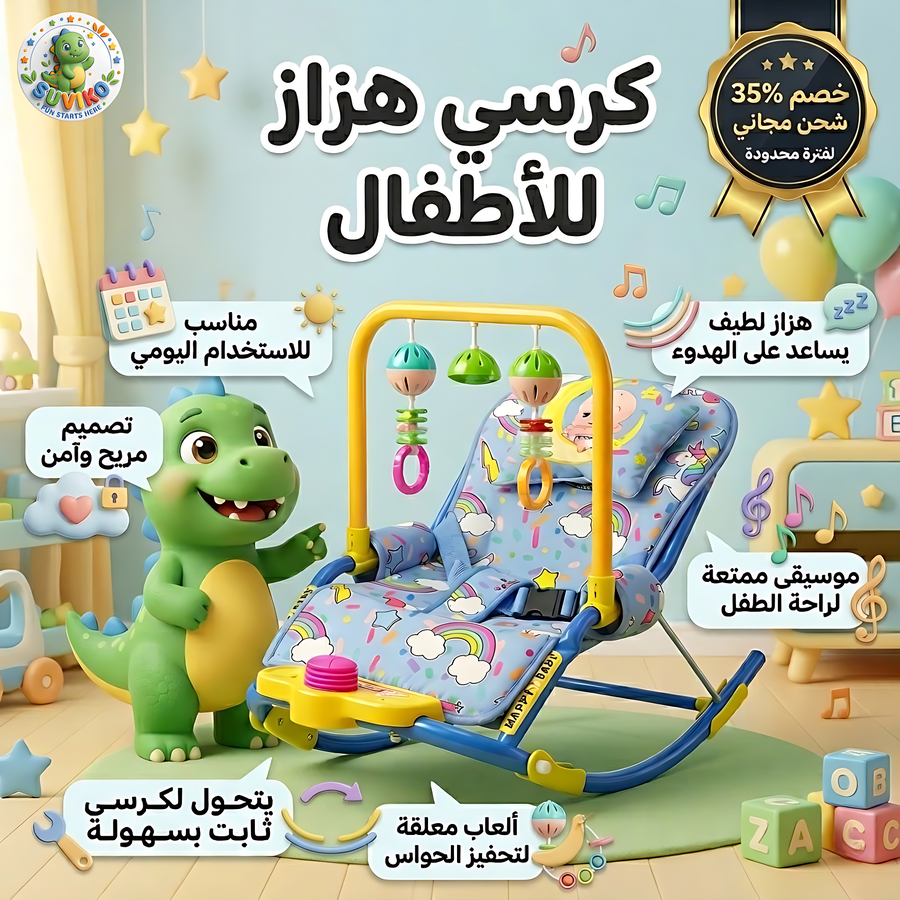 كرسي هزاز للأطفال بموسيقى وألعاب معلقة، تصميم مريح وآمن، يتحول لكرسي ثابت، يساعد على تهدئة الطفل وتنمية التفاعل والحركة.