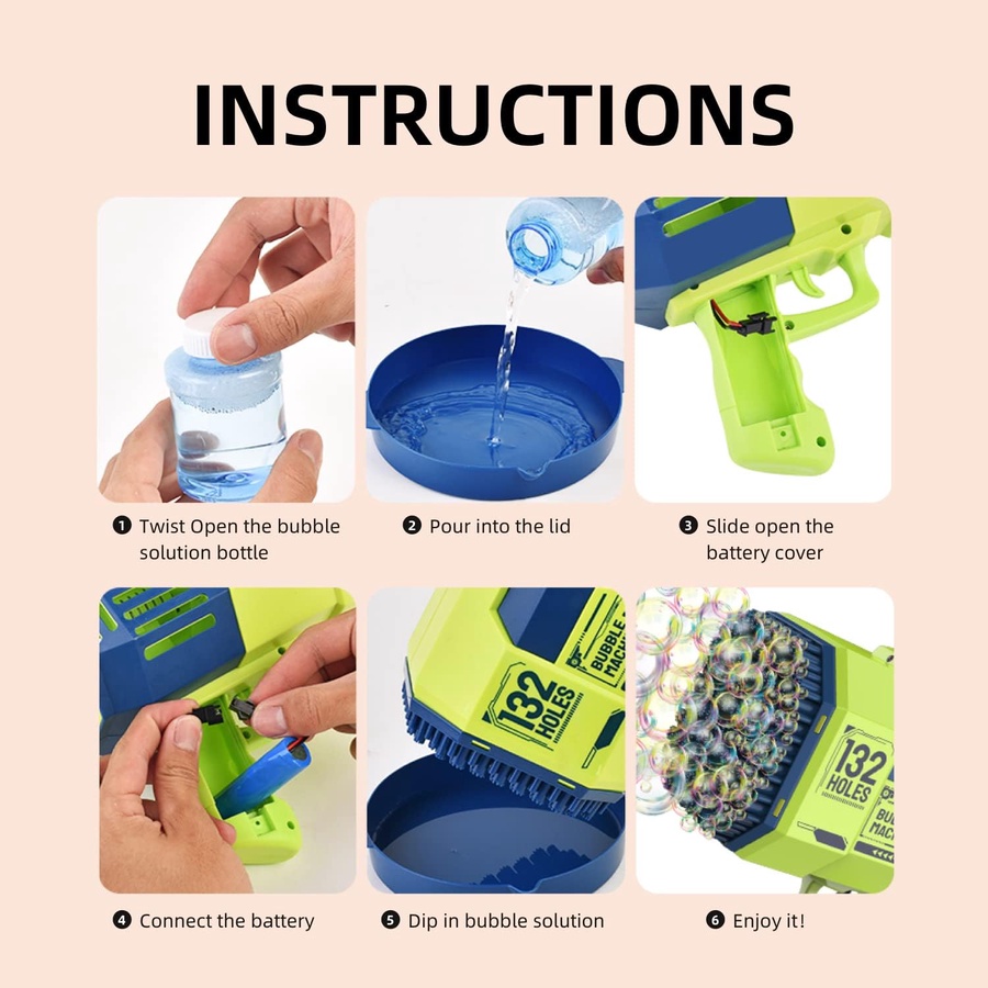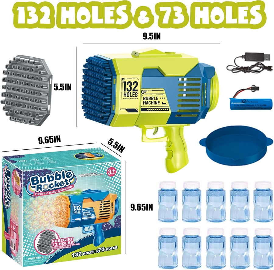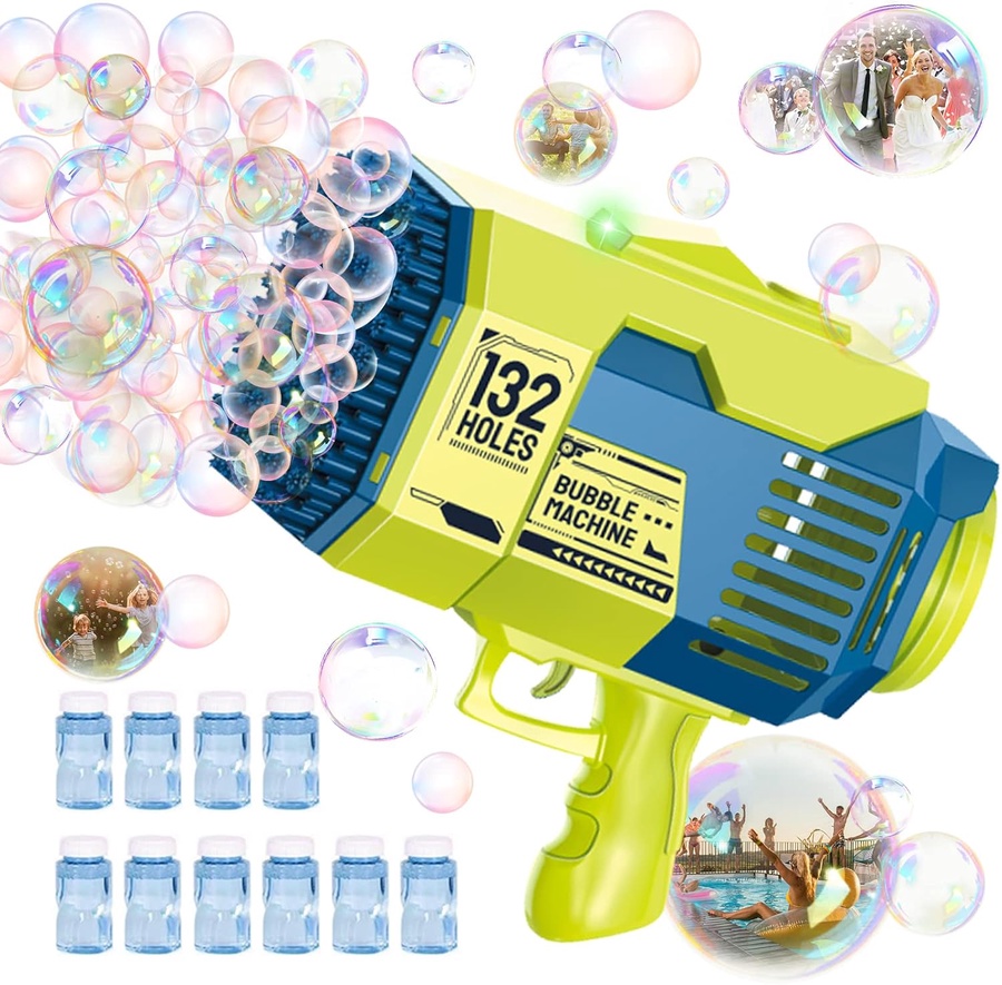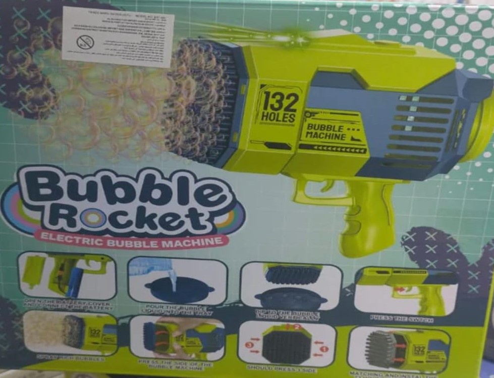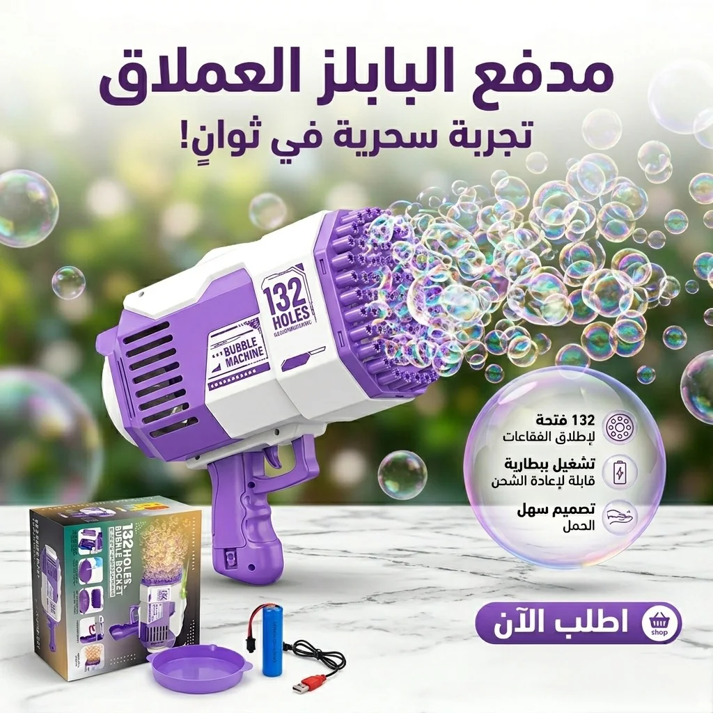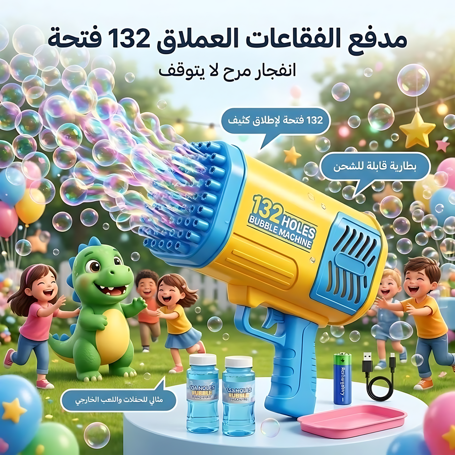 مدفع الفقاعات العملاق 132 فتحة هو من أفضل ألعاب الفقاعات للأطفال لمحبي المرح والحركة، حيث يطلق مئات الفقاعات خلال ثوانٍ بفضل 132 فتحة إطلاق وتصميمه العملي سهل الاستخدام. يأتي مع بطارية قابلة للشحن وعبوات سائل فقاعات، ليكون اختيارًا ممتازًا لكل من يبحث عن مسدس فقاعات للأطفال مناسب للحفلات والحدائق والشواطئ. إذا كنت تبحث عن لعبة فقاعات كبيرة تضيف جوًا من البهجة والتسلية، فهذا المنتج من أفضل الاختيارات.