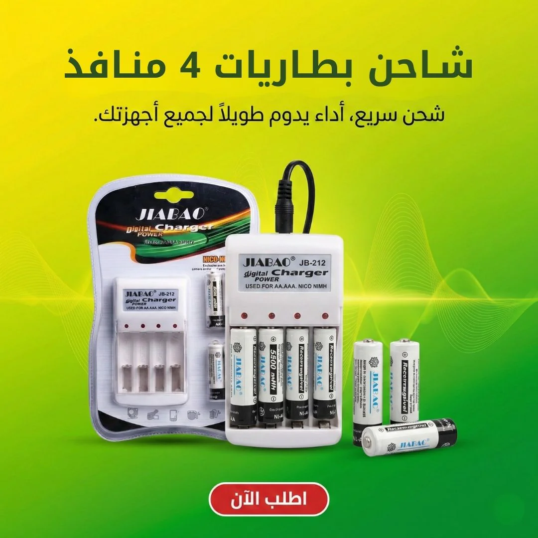 شاحن بطاريات جياباو JB-212 عملي وسهل الاستخدام، بيشحن بطاريات AA وAAA القابلة للشحن، وبيجي معاه 4 بطاريات . مناسب لأي أجهزة بتشتغل بالبطاريات زي الريموت، الألعاب، الكاميرات وغيرها.
